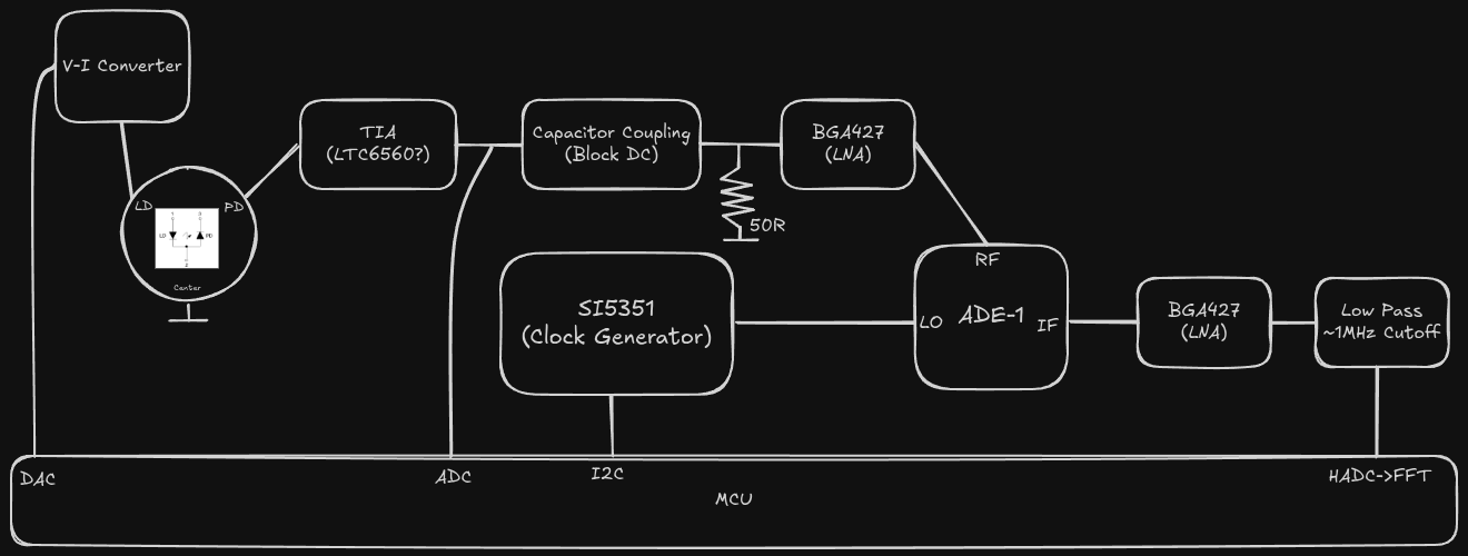 My immediate thought after calculating the peak frequency to be 45MHz was to use SDR… There’s a project which scans the tuning frequency of an RTL-SDR or HackRf to produce a wider spectrum graph, and it’s capable of plenty fast tuning. But this would necessitate an expensive HackRf (or upconverter), and a Linux system, since no commercially available SDR’s (which I know of) have simple SPI or similar interfaces.