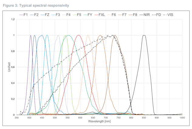 14 channel 16 bit multipurpose spectral light sensor 11 channels 380-1100nm in visible spectrum 1 near infrared 1 clear channel ?? last channel?