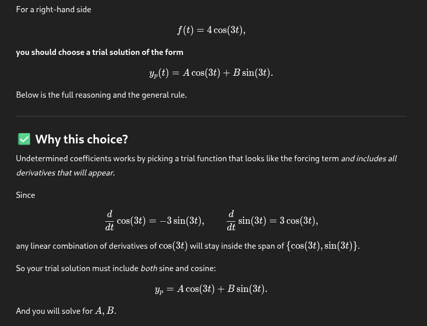 Also, if the right side matches the form of any term of the homogeneous solution, then try as the undetermined coefficient, instead of just
