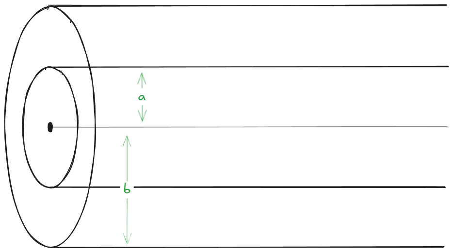 A very long pipe has a distributed charge within it’s volume as ρ(r)=Dar5 where D is a constant, a is the inner, and b is the outer radii.