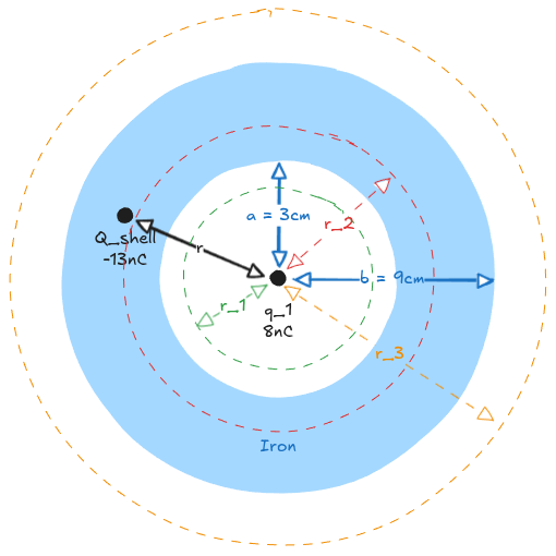 Calculate the surface charge density on the inner and outer surface of the iron shell