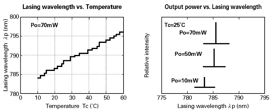 The diode also has varying wavelength as a function of both power and temperature: (from the datasheet)
